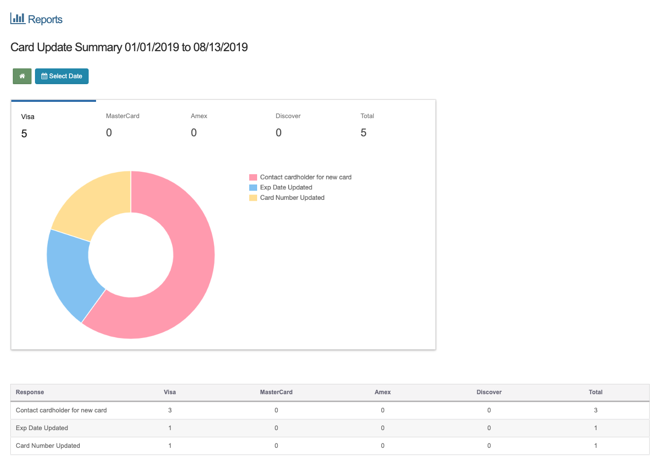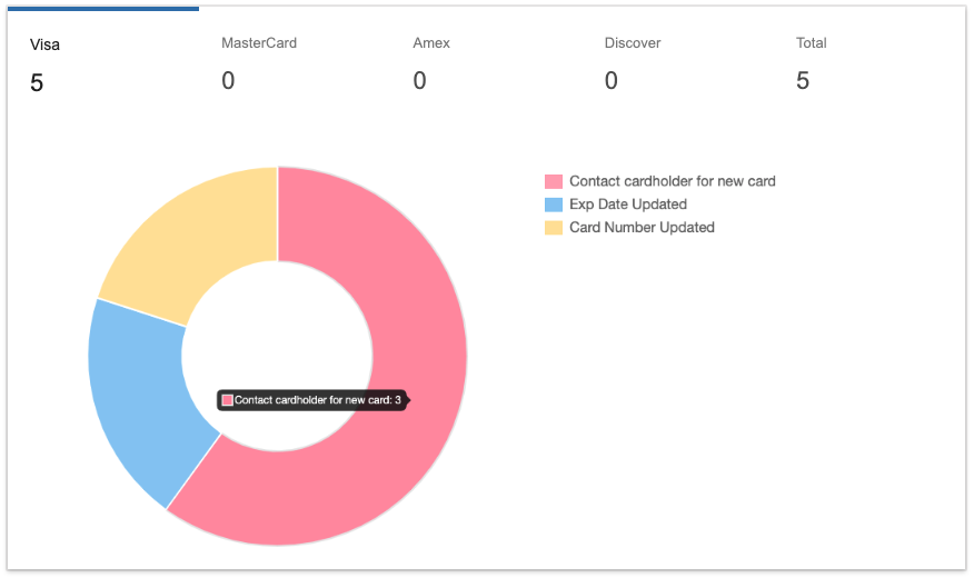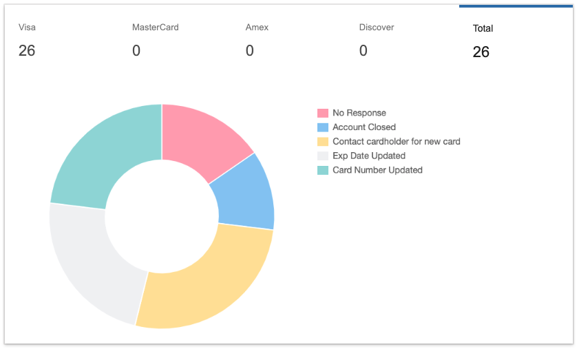 This graph summarizes the report. You can filter the graph between the different card types and responses. To change the card type, simply click on the name of the card type at the top of the graph section to only show that card brand. Total will show you all of the card brands.