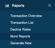The More Reports button is a shortcut to your other reports. At the top you will see any custom reports (the image below contains a custom report named "Declines & Errors"). Below your custom reports you will see the pre-made categories. Hovering over pre-made categories will expand and show the reports in each section. Click on the title to navigate to that report.