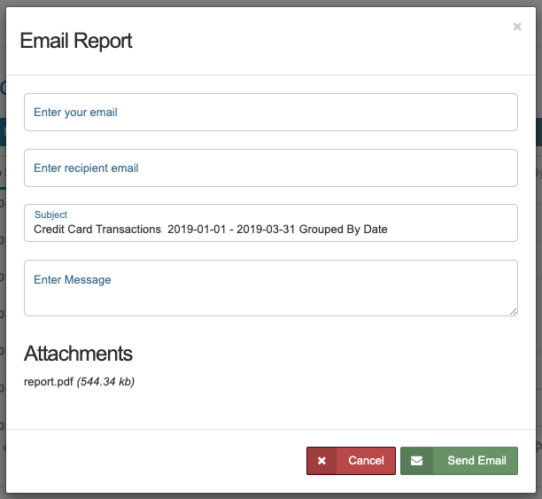 | Clicking this option will open a modal (pictured below) that once completed, will email the currently viewed report to an email address of your choosing in the form of a PDF file. |